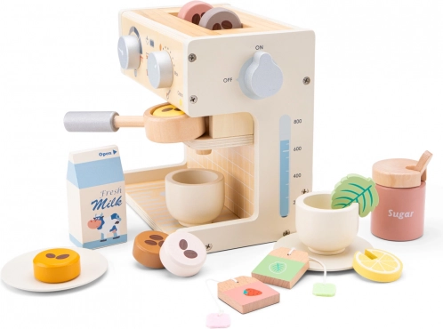 Le set inclut une riche panoplie d’accessoires : 6 capsules de café colorées, 2 sachets de thé, une feuille de menthe, une tranche de citron, une sucrière, un pot à lait et 2 tasses avec soucoupes. Jouer avec la cafetière soutient la coordination œil-main, l’apprentissage par le jeu et le développement de l’autonomie.