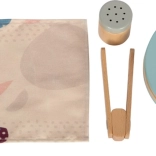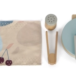 Le set comprend également une serviette en tissu, une pince pour un service en toute sécurité et une sucrière qui émet un agréable son de crécelle lors du saupoudrage. La conception robuste en bois aux couleurs modernes et aux matériaux agréables est idéale pour la cuisine des enfants.
