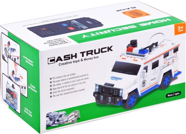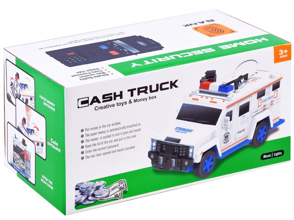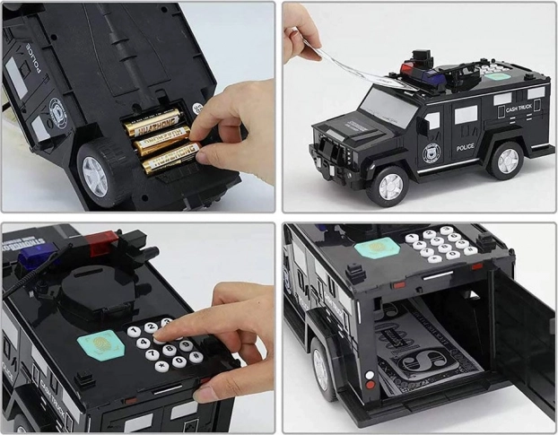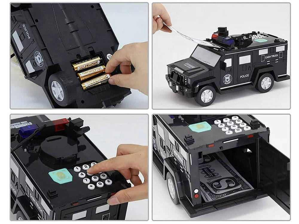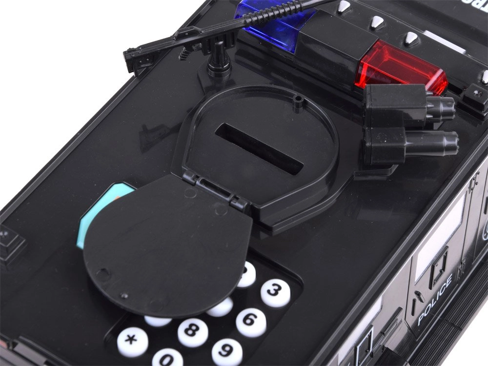 Cette tirelire interactive en forme de voiture de police protège les économies des enfants tout en les divertissant. Les enfants peuvent saisir un code de sécurité (par défaut 0000), le confirmer en touchant le scanner d’empreinte digitale (simulation) et ouvrir la porte du coffre. Les billets sont aspirés automatiquement par la fente avant, les pièces s’insèrent par l’ouverture supérieure sous le couvercle.