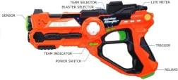 Le Laser Tag est un jeu d'équipe qui combine stratégie et divertissement. Les joueurs choisissent leur équipe selon les couleurs des lumières indicatrices sur le pistolet et tentent de toucher leurs adversaires. Utilisez le sélecteur d'équipe TEAM SELECTOR pour choisir l'équipe et le sélecteur de blaster BLASTER SELECTOR pour les armes. L'ensemble comprend deux pistolets aux couleurs vives qui simulent le tir avec différents modes et des « vies » prédéfinies.