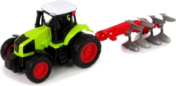 Cabine détaillée, grandes roues profilées et charrue amovible pour une vraie ambiance agricole.