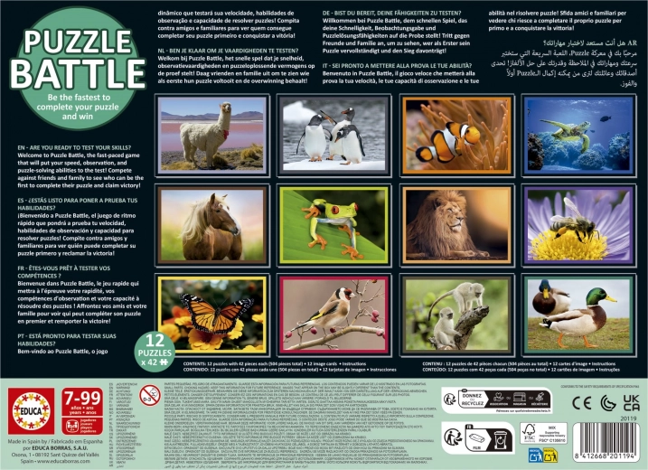 Educa bataille de puzzles Nature : 12 mini puzzles de 42 pièces pour un plaisir compétitif rapide. Développe l’observation, la patience et la coordination. Idéal pour les enfants et les familles.