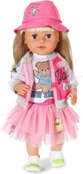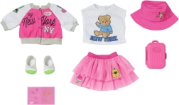 Un élégant ensemble de voyage pour poupées BABY BORN de 43 cm qui transforme chaque jeu en aventure. Il comprend une veste assortie avec motif NY, un t-shirt avec ourson, une jupe en tulle rose, un bonnet, des chaussures et une mini valisette pratique. Idéal pour le jeu créatif en voyage, un habillage facile et un amusement durable.