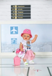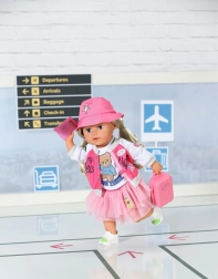 Offrez à votre poupée BABY BORN la tenue parfaite pour voyager. Cet ensemble aux tons roses allie confort et style – de la veste légère au motif NY iconique, au t-shirt ludique avec ourson, jusqu’à la jupe en tulle vaporeuse et aux chaussures confortables. Sont également inclus une adorable valisette et un passeport de voyage pour des scénarios de jeu réalistes.