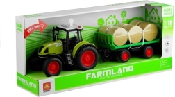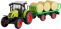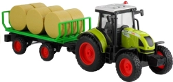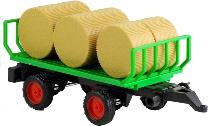 La remorque amovible transporte 6 bottes de foin, que l’on peut charger et décharger à volonté. La traction à friction permet au tracteur d’avancer après une poussée, tandis que les roues en caoutchouc à bande de roulement assurent une conduite stable sur différentes surfaces. Le jouet est fabriqué en plastique de haute qualité et résistant sans arêtes vives, conforme au marquage CE et à la norme EN 71.