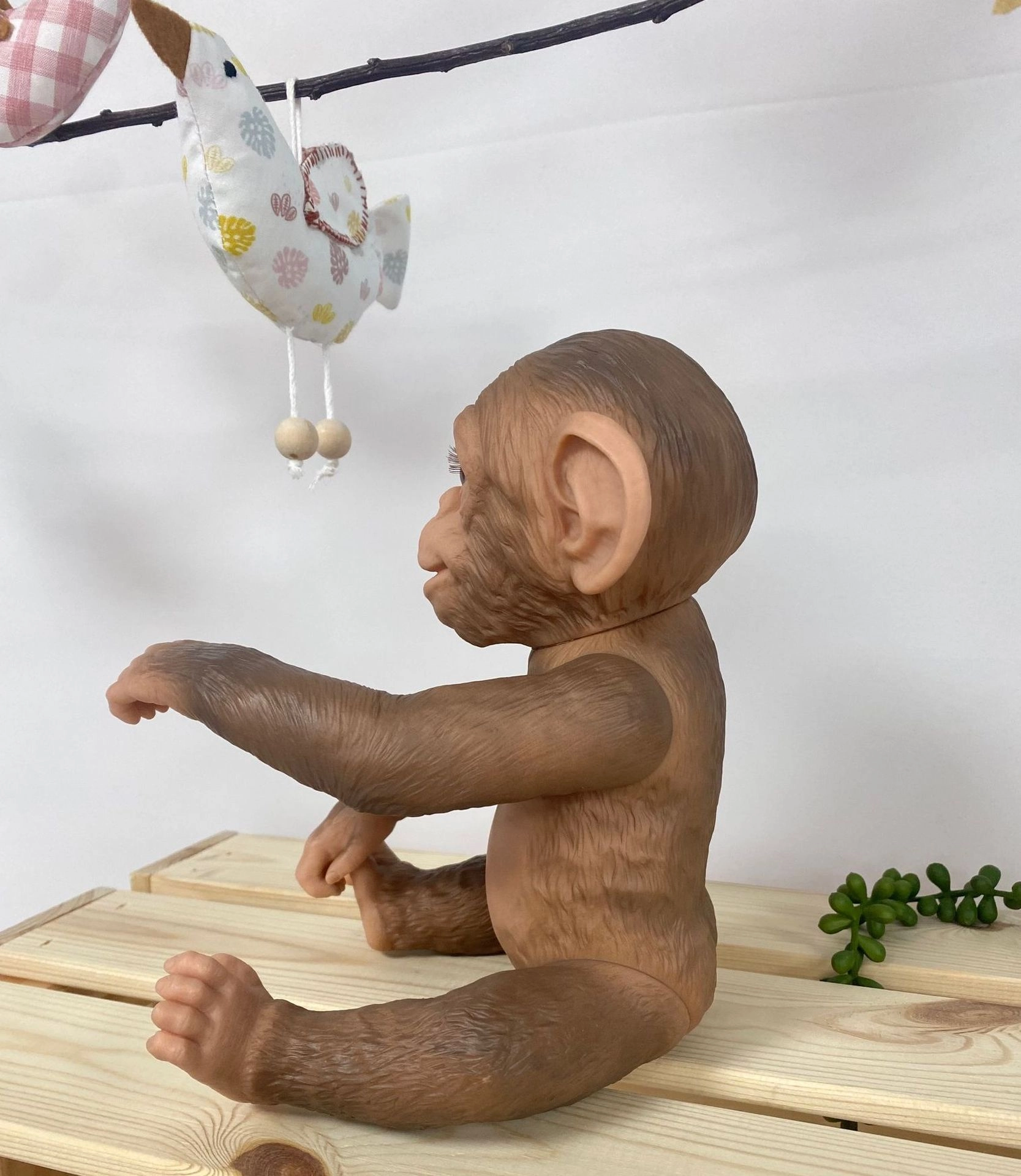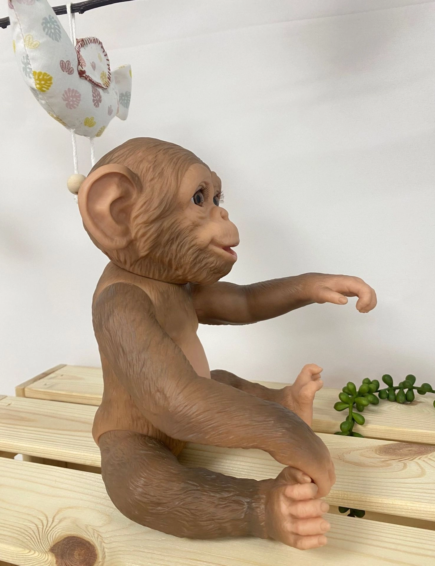 Ce bébé singe reborn réaliste séduit par le travail détaillé du visage, des plis et de la texture de la « fourrure » sur le vinyle. La conception entièrement en vinyle permet un bain délicat (attention aux cils), tandis que le sexe n’est pas indiqué. Les membres sont fixés par des articulations, ce qui permet au jouet de garder facilement des poses – il peut s’asseoir, se tenir ou être suspendu par les bras ou les jambes.