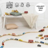 • Set de 7 petites voitures en bois, idéal pour développer l’imagination et les compétences sociales.