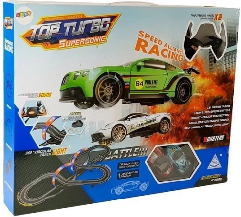 Le circuit peut être monté en deux configurations, afin d’adapter facilement le plaisir de jeu à l’espace et au style de conduite. Les commandes disposent de boutons pour augmenter la vitesse et des effets sonores d’accélération. Des LED multicolores ajoutent un spectacle visuel attractif aux courses et encouragent les enfants à se concentrer, développer leurs réflexes et leur esprit de compétition.