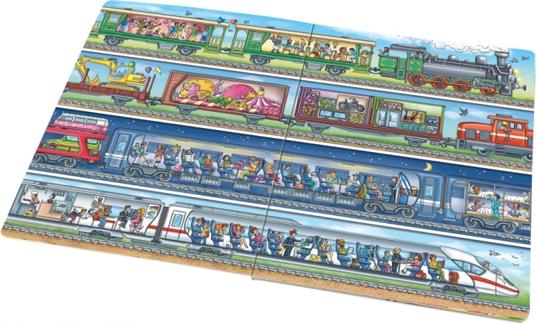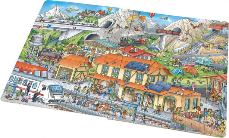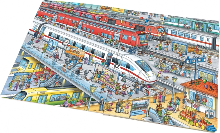 Ce grand livre illustré ravira tous les petits amateurs de trains. Grâce à des images riches et soigneusement détaillées, les enfants plongent au cœur de l’univers ferroviaire – des locomotives et wagons aux gares animées, jusqu’aux stations de campagne paisibles. Chaque page foisonne de petits détails et de personnages à rechercher, avec lesquels les enfants peuvent partager et imaginer leurs histoires.