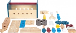 Un marteau, une clé et un tournevis en bois complétés par des vis, des écrous et des pièces perforées – tout pour entraîner la motricité fine et l’imagination.