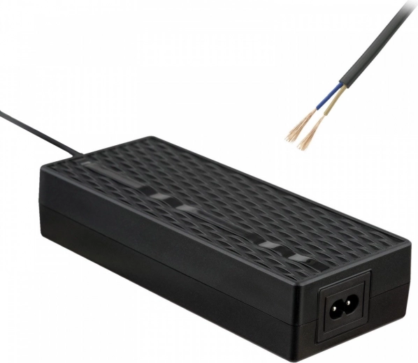 Chargeur universel AKYGA pour vélos et trottinettes électriques 48 V (13s) avec extrémité de câble ouverte pour choisir votre propre connecteur. Offre une haute efficacité >80 %, un câble de sortie de 1 m pratique, une alimentation via IEC C8 et un indicateur LED de charge pratique. Livré dans un emballage écologique.