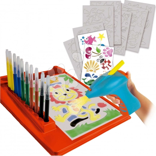 - Pistolet pulvérisateur automatique, 10 feutres colorés, centre de dessin, pochoirs, mode d’emploi