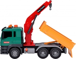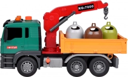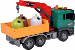Le camion est équipé d'une grue avec un bras pivotant pour soulever et déplacer les poubelles. La benne du véhicule peut être levée et abaissée pour vider facilement la charge.