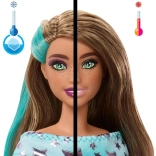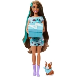 BARBIE aux cheveux longs avec mèches turquoise, robe scintillante ornée d’étoiles violettes et chaussures tendance. Inclus : un chien câlin avec bandana.