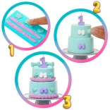 Façonne un gâteau à deux étages avec la pâte, décore à l’aide des moules et outils. L’eau froide/chaude révèle des détails de fête spéciaux sur le visage de la poupée.