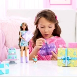 Découvre qui se cache à l’intérieur ! Cette version comprend une BARBIE brune avec des mèches turquoise, une robe scintillante à étoiles violettes et des chaussures violettes assorties. Le set inclut aussi un adorable corgi avec bandana – l’invité d’honneur de toute fête d’anniversaire.