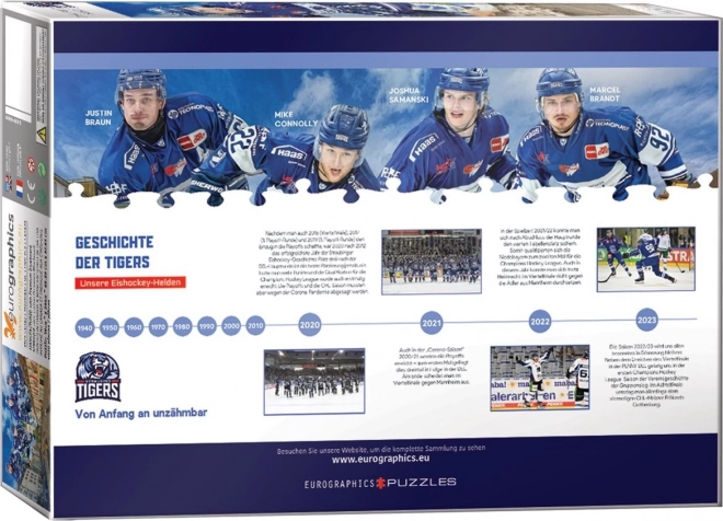 Profitez d’un divertissement de qualité avec le puzzle EUROGRAPHICS représentant les STRAUBING TIGERS. L’emballage contient 1000 pièces et une fois assemblé, il forme une image d’environ 68 × 48 cm. Idéal pour les fans de hockey et les amateurs de puzzles précis.