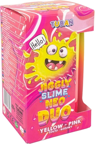 Jiggly Slime Neo Duo est un excellent choix pour les enfants comme pour les adultes qui aiment les jouets antistress. Grâce à sa formule unique, le slime ondule de façon ludique, s’étire joliment et permet de créer des bulles ainsi que des tours originaux. La version bicolore en jaune et rose néon se combine efficacement pendant le jeu en une teinte impressionnante.