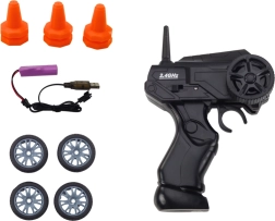 Deux types de roues sont inclus : à bande de roulement pour une meilleure adhérence, et roues lisses pour un drift spectaculaire. Créez votre propre piste à l’aide des cônes fournis et entraînez-vous aux virages et au slalom. La voiture est alimentée par une batterie 3,7 V (incluse), la télécommande nécessite 2× AA (non incluses).