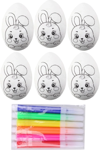 Œufs de Pâques en polystyrène à peindre avec motif lapin, 6 pcs + feutres