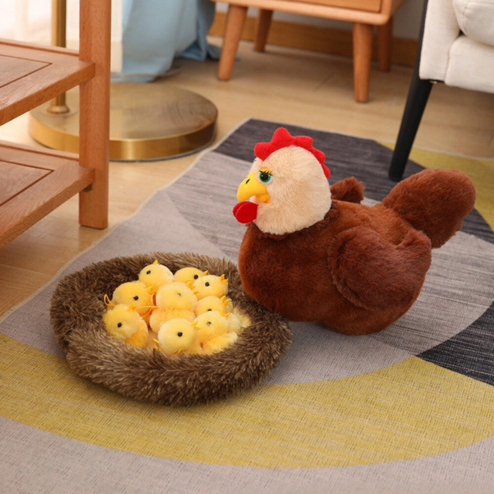 Poule en peluche avec poussins et nid