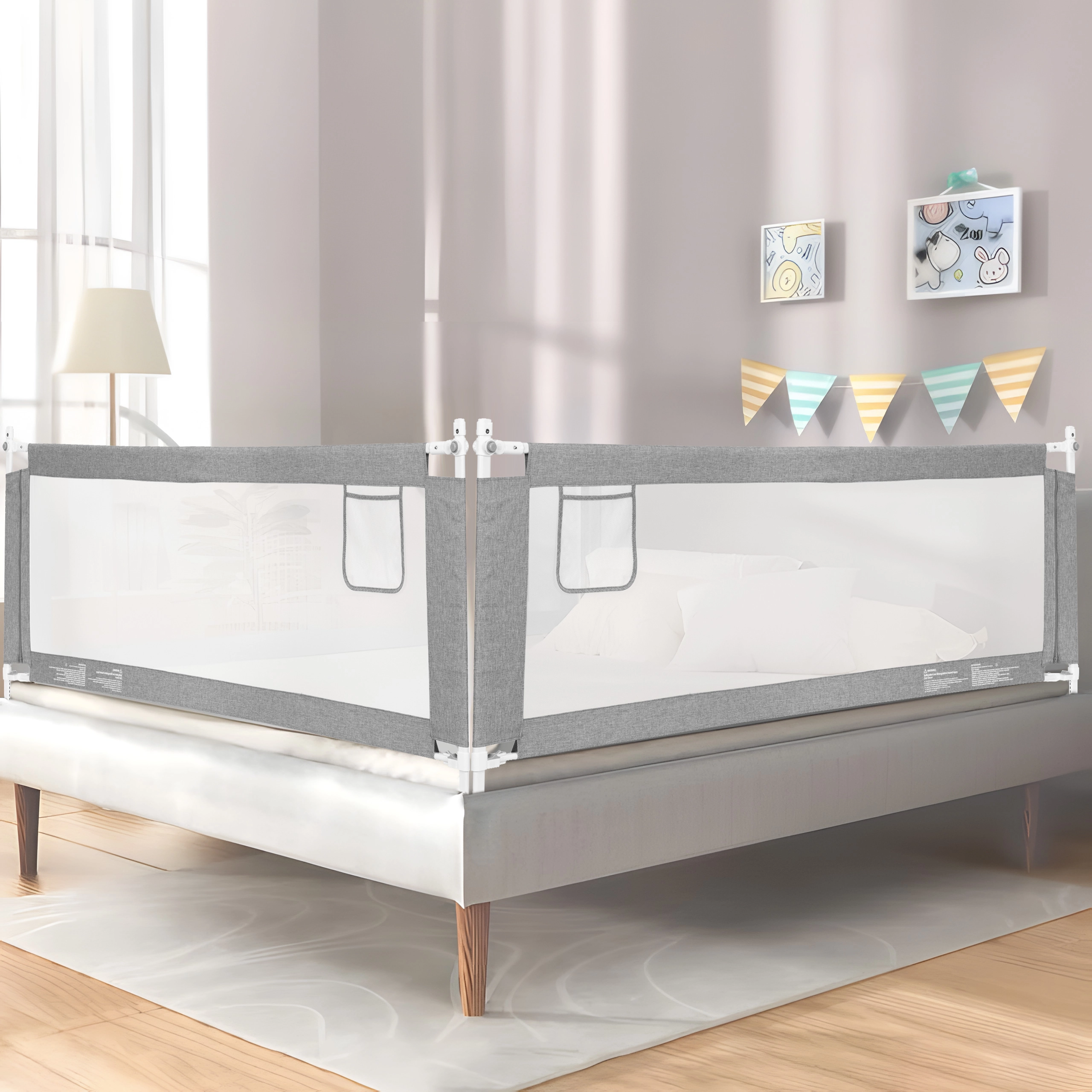- Montage universel – installation possible de n’importe quel côté du lit, combinable pour faire le tour complet.