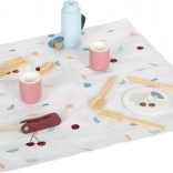 Le sac à dos comprend tous les accessoires nécessaires, y compris des assiettes, des tasses et des ustensiles en bois, idéal pour des repas confortables en plein air.