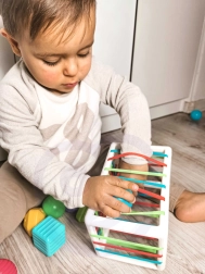 L’enfant développe ses sens et sa dextérité manuelle en jouant avec le cube et les différentes formes.