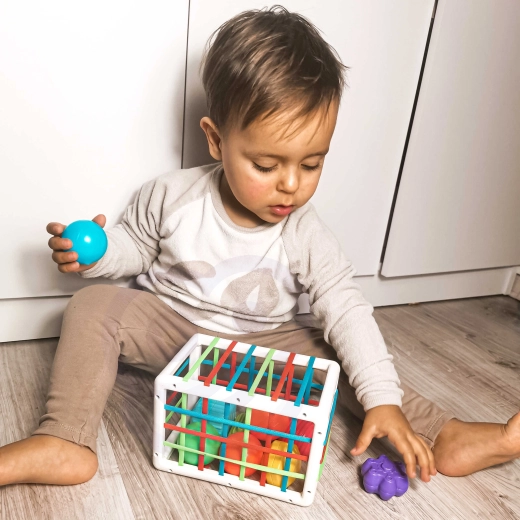 Ce cube amusant et éducatif pour enfants contient 12 pièces différentes qui éveillent la curiosité et encouragent l’envie d’expérimenter. Le cube est équipé de 6 balles souples et de 6 cubes sensoriels rigides avec différentes textures, couleurs et formes. Cette combinaison aide au développement des sens et de la pensée de l’enfant, l’encourageant à explorer.