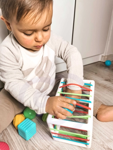 Le cube peut également être utilisé pour l’apprentissage des couleurs et des formes à un âge ultérieur. Les élastiques colorés du cube sont agréables pour l’enfant et facilitent l’insertion des objets. Ce produit indispensable est idéal pour les enfants à partir de 12 mois et aide à développer la motricité fine.