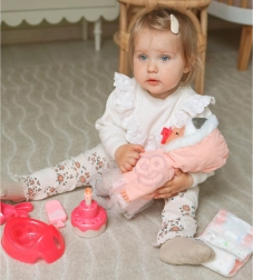 - poupée, robe, couche, biberon, gâteau d’anniversaire avec son, bol, tétine, petits accessoires