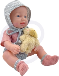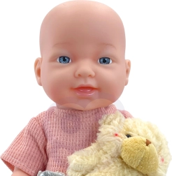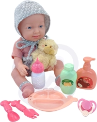 Le set contient tout ce qu’il faut aux petits soigneurs : poupée habillée, tétine, ourson, biberon et kit de repas (assiette, fourchette, cuillère), complétés par deux flacons de “cosmétiques” pour les scènes de bain et de soin. La poupée possède des membres souples en caoutchouc, articulés et un corps en plastique sans rembourrage en peluche.