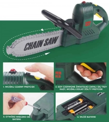 La grande scie jouet de Woopie est conçue pour un jeu amusant et sûr. Les enfants peuvent imiter le travail des adultes tout en étant protégés par les équipements de protection inclus. Il suffit d'appuyer sur le bouton noir sur le dessus, et lorsque la lumière rouge clignote trois fois, appuyez sur le bouton sur la poignée pour voir la chaîne se déplacer le long du guide comme une véritable scie !