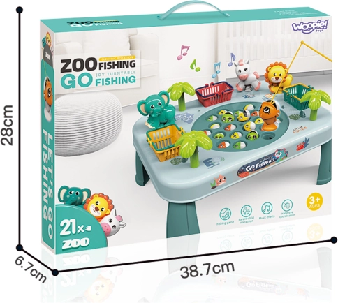 Contenu de l’emballage : 1 table de jeu, 4 pieds, 3 cannes, 3 paniers à poissons, 3 figurines d’animaux, 3 palmiers, 21 petits poissons, autocollants.