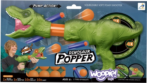 Un lanceur pour enfants en forme de dinosaure de la marque WOOPIE apporte du jeu d’action à la maison comme au jardin. Chargez des balles en mousse ou des fléchettes en mousse, armez et tirez sur les cibles. Le jouet est facile à utiliser, léger et portable. L’ambiance est renforcée par des effets lumineux (yeux lumineux) et des effets sonores (ROAR !). Une excellente idée de cadeau pour les enfants dès 3 ans.