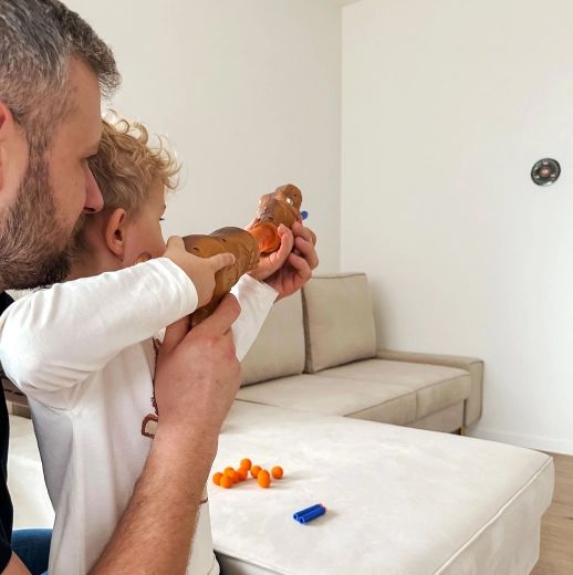 Le blaster dinosaure WOOPIE transforme chaque mission d’enfant en aventure. Il suffit d’insérer une balle en mousse ou d’installer l’adaptateur pour fléchettes, de tirer la tête du « T-Rex » et de relâcher – et le fun commence. Grâce à sa grande portée et à sa facilité d’utilisation, les enfants peuvent, seuls ou avec des amis, organiser un concours de tir sur cibles.
