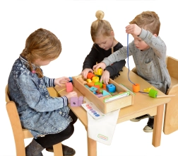 L’activité peut consister à regrouper, trier, compter ou enfiler des perles. Des supports sur lesquels enfiler les perles peuvent aider. Les enfants peuvent utiliser des cartes de tâches présentant des modèles possibles, ou laisser libre cours à leur propre créativité.