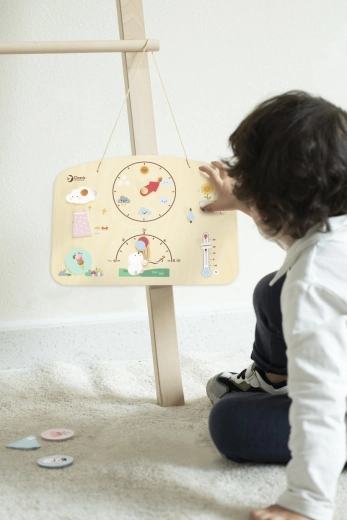 Ce tableau astucieux et amusant aide les enfants à comprendre ce qui se passe dehors. En tournant et en déplaçant simplement les éléments, les enfants règlent eux-mêmes la météo actuelle et apprennent à la nommer correctement. Grâce à sa construction robuste en bois et à des peintures sûres et non toxiques, le tableau est idéal pour la chambre d’enfant, la maternelle et les voyages.