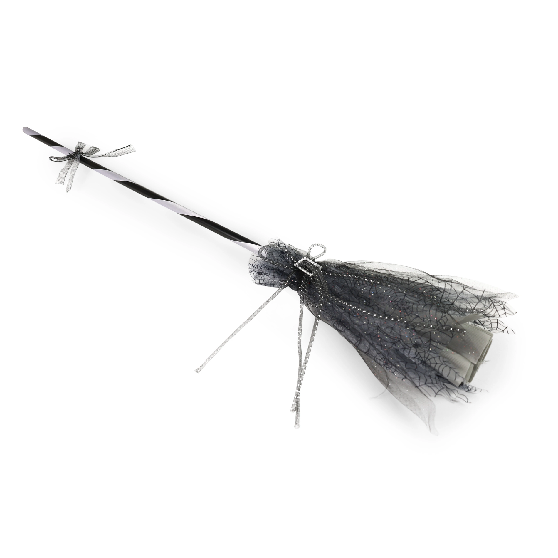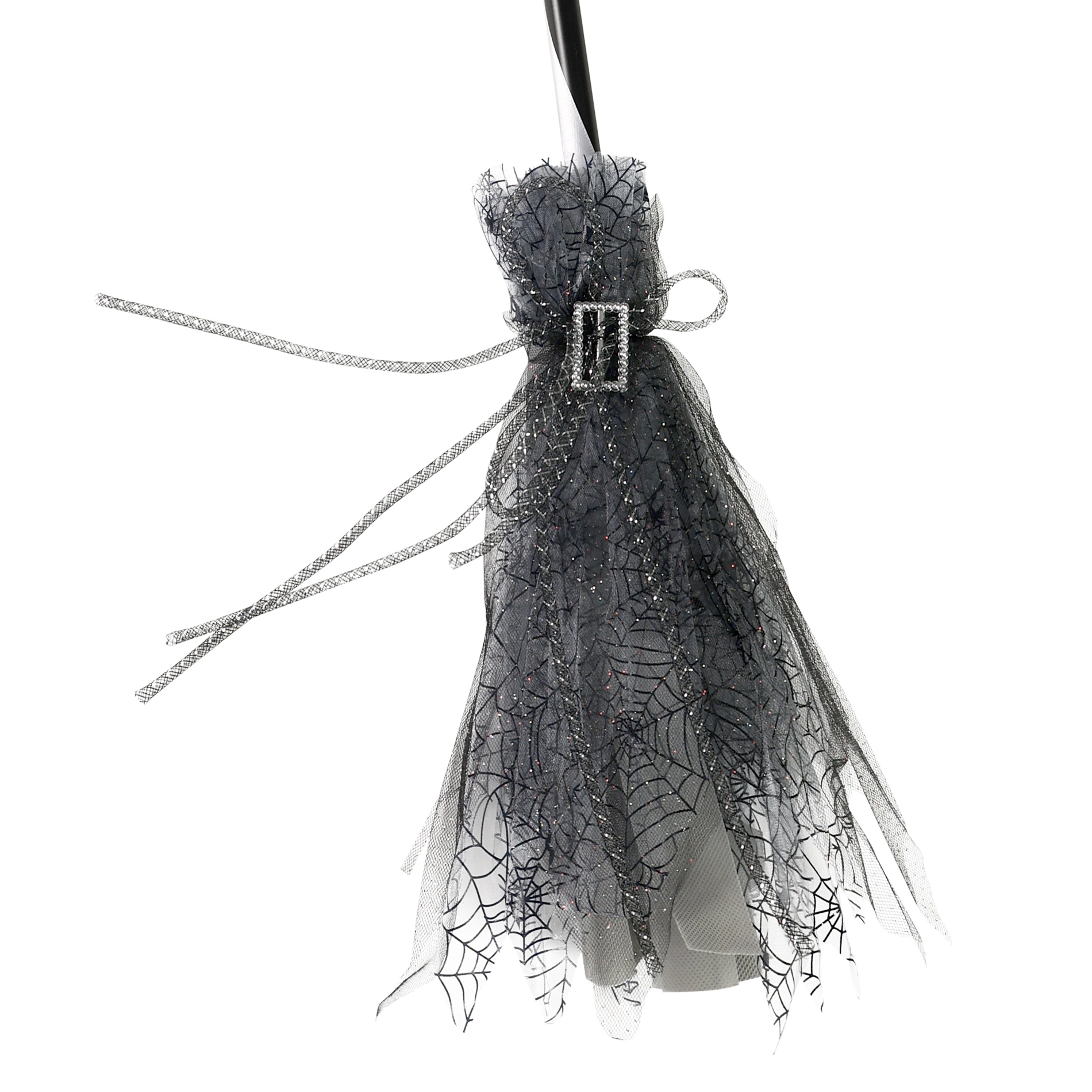 Apportez la touche finale parfaite à votre costume de sorcière. Ce balai de sorcière au design élégant noir‑gris, orné d’une boucle argentée et d’une délicate « jupe » en tulle, crée un effet spectaculaire à chaque pas. Léger en main, il est idéal pour poser et danser sur la piste.
