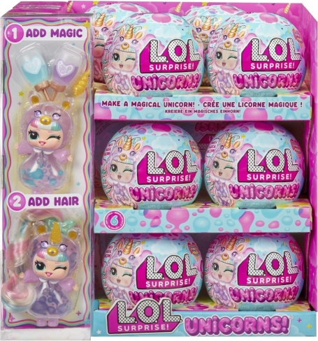 Découvrez la magie des licornes avec la nouvelle collection L.O.L. Surprise ! Chaque poupée possède des éléments transparents, un effet de « lampe à lave » colorée et de véritables cheveux et queue. Grâce à une base spéciale et aux « potions », vous créez des bulles colorées à l’intérieur de la figurine. Pour une expérience encore plus intense, éclairez les Tots avec la lumière de votre téléphone et regardez les couleurs s’illuminer. Le présentoir comprend 12 pièces dans différents styles – idéal pour les collectionneurs et comme cadeaux.