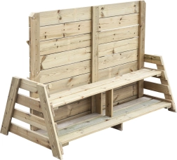 La structure est fabriquée en bois de pin imprégné, résistant aux intempéries et traité en toute sécurité avec un revêtement non toxique. Le dos du panneau comprend un banc pratique et une étagère inférieure pour déposer les jouets – idéal pour une courte pause entre deux jeux.