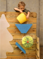 - Jeu sensoriel polyvalent : eau et sable, entonnoirs, goulottes et moulin.
