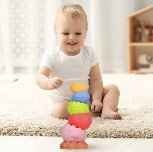 Ce set de construction multifonctionnel avec des pièces rondes et texturées dans de douces couleurs pastel est idéal pour les premières découvertes et le tri. Les enfants peuvent empiler les éléments, les saisir, les presser et explorer les chiffres et formes en relief, développant ainsi naturellement leurs compétences motrices et leur sens mathématique précoce.