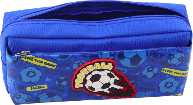 Trousse scolaire élégante de couleur bleue avec un motif de football dynamique. Elle offre deux compartiments spacieux zippés, une construction résistante et une organisation claire des fournitures d’écriture pour un usage scolaire quotidien.