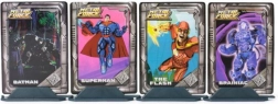 Brainiac, Batman, Superman et Flash à une hauteur pratique d’environ 5 cm, avec des détails soignés et un effet métallique – prêts à être exposés ou utilisés en jeu.