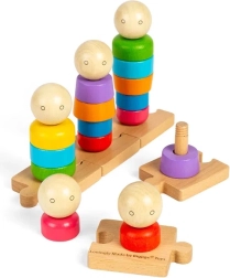 Découvrez un jeu créatif pour les tout-petits : un ensemble en bois à empiler avec des anneaux colorés et des personnages sur cinq tiges, posés sur une base puzzle. Les enfants peuvent combiner librement les couleurs, les formes et les visages, développer leur imagination et apprendre en jouant. Le jouet stimule la motricité fine, la coordination œil-main, la reconnaissance des couleurs et des formes et la résolution de problèmes. Fabriqué en bois certifié FSC et coloré avec des peintures non toxiques, inspiré des principes Montessori.