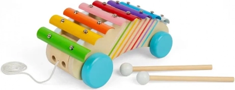 Ce xylophone à tirer ludique encourage la découverte naturelle du rythme et des sons. Grâce à ses huit lames métalliques colorées, les enfants produisent facilement des tonalités joyeuses, tandis que la traction avec la corde stimule la motricité fine et globale. Idéal comme premier pas dans l’univers musical – amusant, sûr et durable.