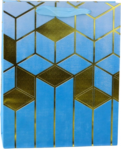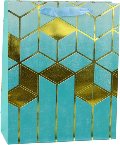 Ce sac cadeau élégant allie design moderne et praticité. Il est orné de motifs géométriques dorés marqués et de couleurs intenses, en faisant un emballage représentatif pour tout cadeau. Le carton décoratif robuste et les anses en corde résistantes assurent un transport confortable et sécurisé.