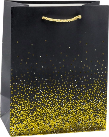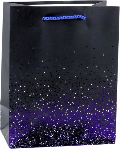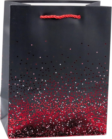Disponible en quatre variantes de couleur : jaune, violet, rouge et turquoise. Chaque couleur est rehaussée d’un fond noir qui souligne l’élégance et le contraste avec l’effet scintillant. De solides poignées en cordon, assorties aux tons du dégradé, assurent un transport confortable, tandis que la construction robuste garantit un rangement sûr même pour des cadeaux plus lourds.