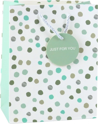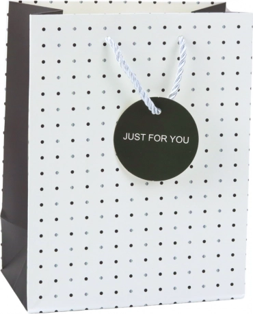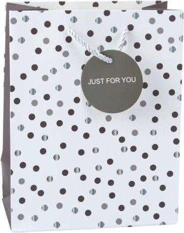 Sac cadeau élégant à pois avec l’inscription « Just For You », idéal pour toutes les occasions.